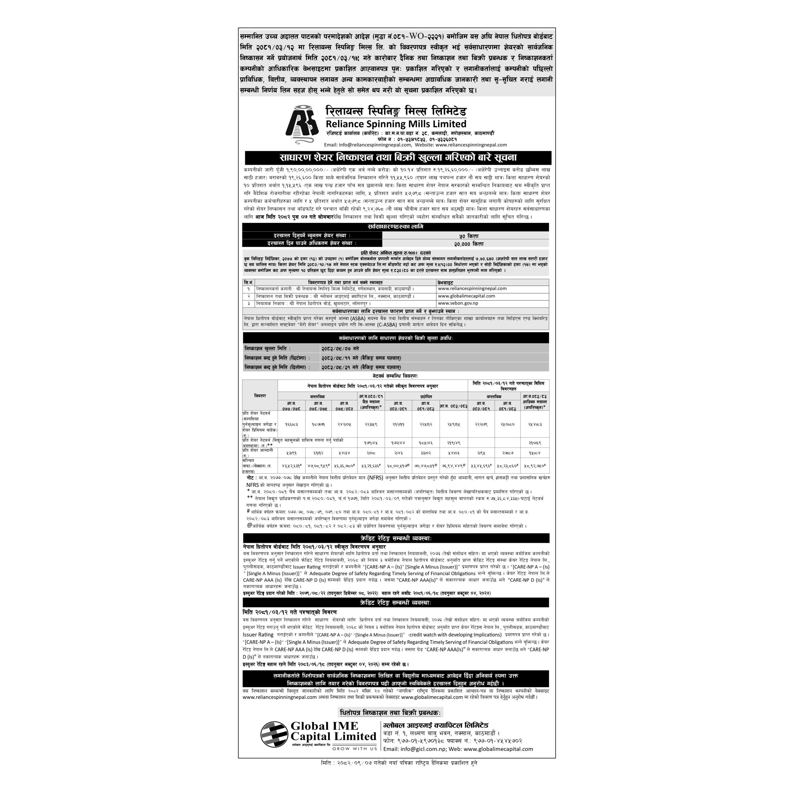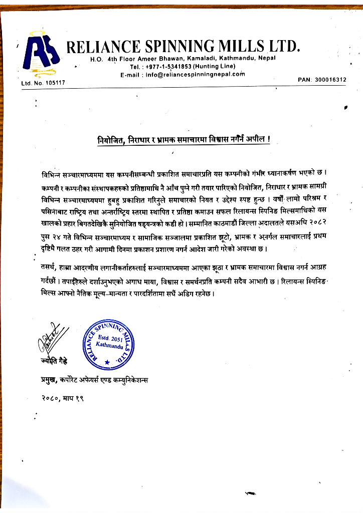 Reliance Spinning Mills Ltd. is a public limited company established in 1994 AD and is the largest spinning mills in Nepal. The company has two factories: Unit A located at Khanar, Sunsari and Unit B located at Duhabi, Sunsari, Nepal. Reliance Spinning is a high-tech spinning plant with both Ring Frame and Vortex machineries from world renowned textile machinery manufacturers such as LMW, Savio, Schlafhorst / Saurer,Reiter, Veejay Lakshmi, Peass, Mylon, Murata & Aalidhra Textool.