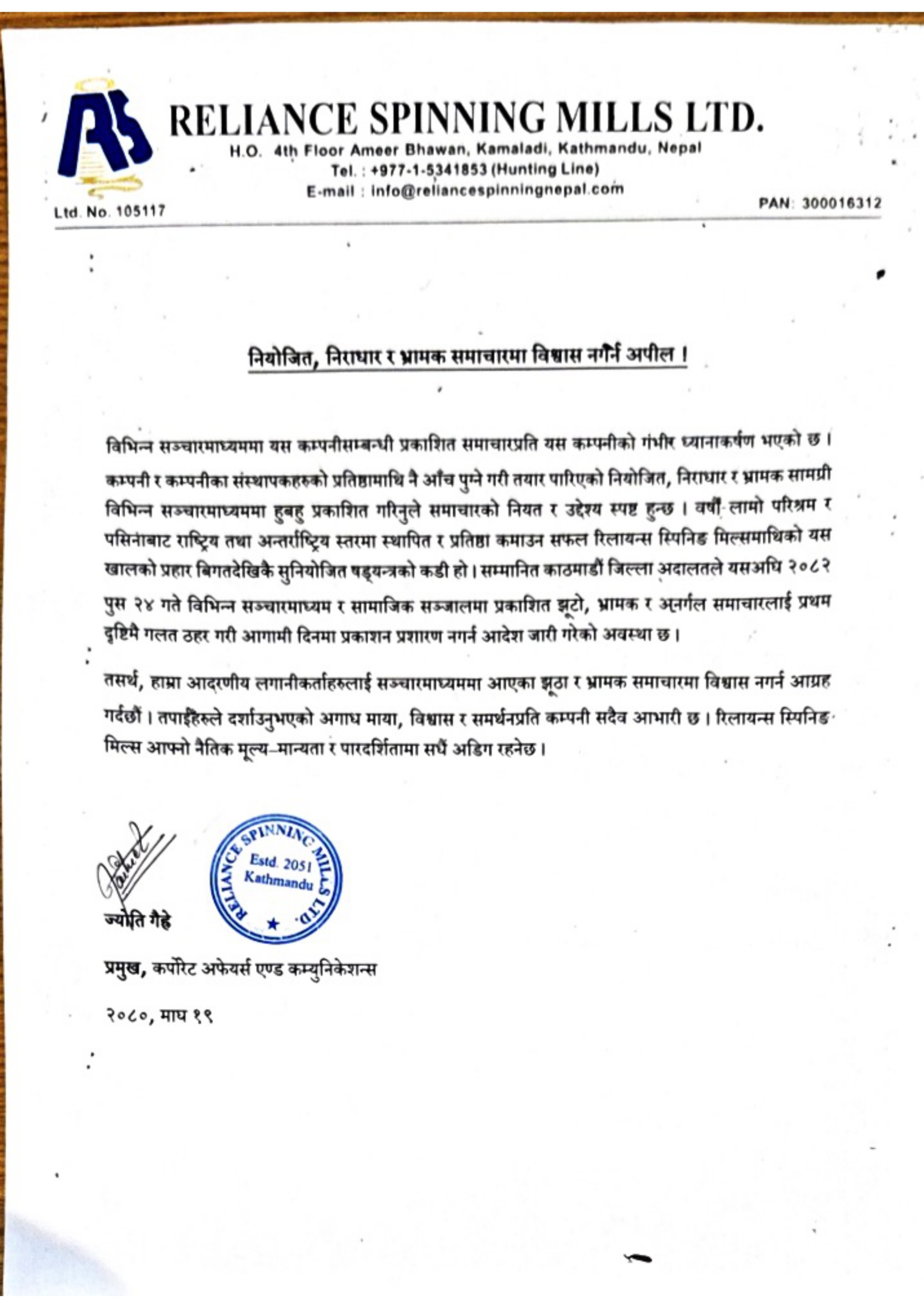 Reliance Spinning has a workforce of over 4000 people including 1300 women, making it the largest employer in Nepal and the single largest exporting company of Nepal with an export of over USD 50 million annually.